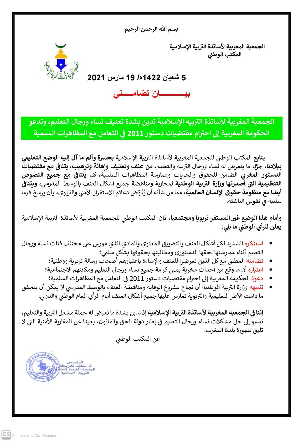 ادانت الجمعية المغربية لأساتذة التربية الإسلامية بشدة في بيان صادر عن مكتبها الوطني اليوم الجمعة 19 مارس 2121 تعنيف نساء ورجال التعليم، ودعت الحكومة المغربية إلى احترام مقتضيات دستور 2011 في التعامل مع مظاهراتهم السلمية؛ وأضاف البيان أن المكتب الوطني للجمعية المغربية لأساتذة التربية الإسلامية يتابع بحسرة وألم ما آل إليه الوضع التعليمي ببلادنا، جرَّاء ما يتعرض له نساء ورجال التربية والتعليم، من عنف وتعنيف وإهانة وترهيب، يتنافى مع مقتضيات الدستور المغربي الضامن للحقوق والحريات وممارسة لحق التظاهر السلمي، كما يتنافى مع جميع النصوص التنظيمية التي أصدرتها وزارة التربية الوطنية لمحاربة ومناهضة جميع أشكال العنف بالوسط المدرسي، ويتنافى أيضا مع منظومة حقوق الإنسان العالمية،