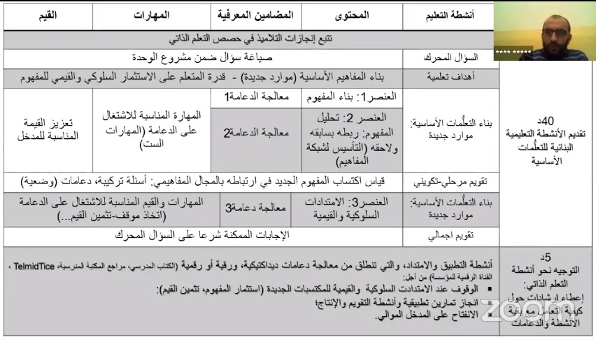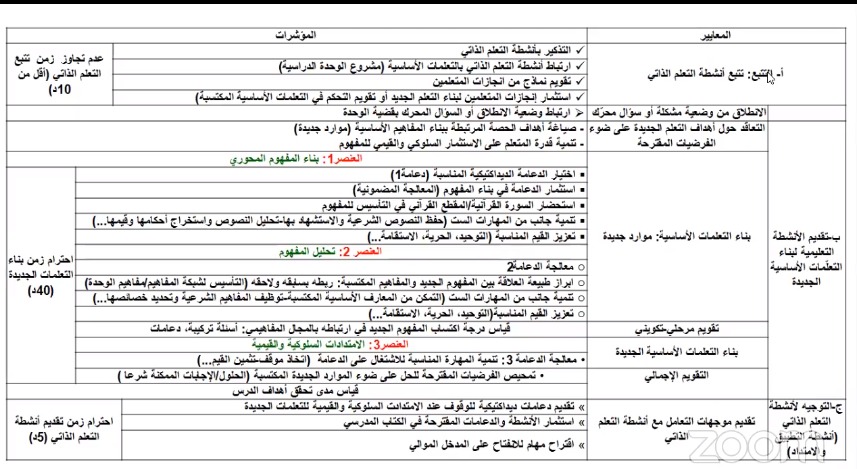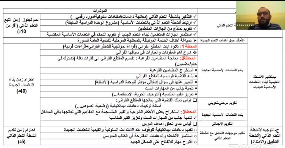 وقد فصل الحديث فيما ورد فيه من أنشطة ومحتوى ومضامين ومهارات، مقترحا خطوات تفصيلية لتدبير ذلك، وشبكة تقييمية ذاتية للتحقق من مدى التدبير الديداكتيكي لحصة القران الكريم الحضورية مع السيناريو البيداغوجي المعد على الشكل التالي: