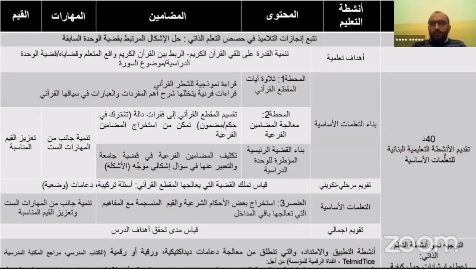 انطق الأستاذ في مداخلته بتعريف للسيناريو البيداغوجي بقوله: هو سيرورة تصميم مجموعة مترابطة من الأنشطة التعليمية، موزعة حسب الزمن ونتاجها هو النشاط التعلمي. ثم انتقل إلى بيان الحضور الوظيفي للنص القرآني في مادة التربية الإسلاميةوفق ما يلي: