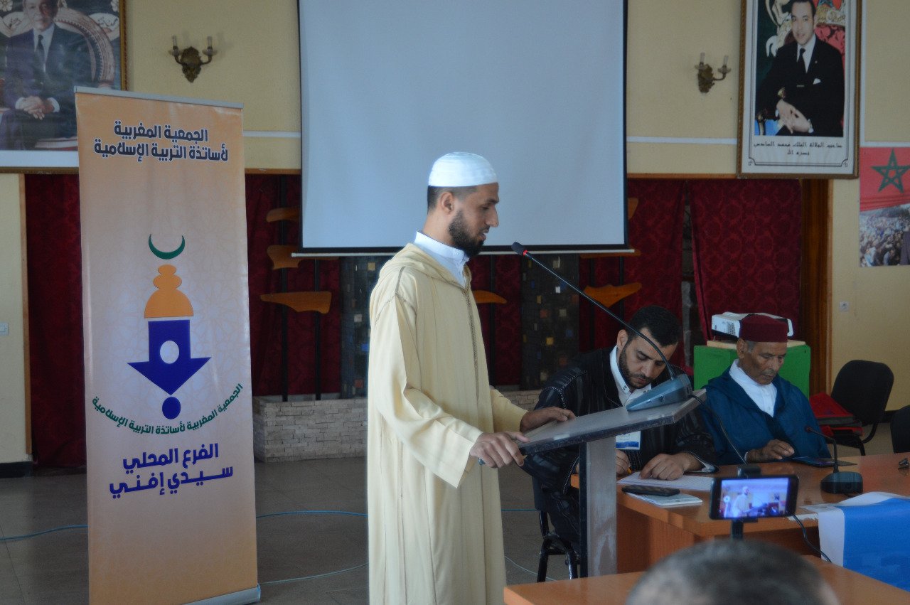 ابتدأ اللقاء على الساعة 11:15 صباحا ، بقاعة المسيرة الخضراء بسيدي إفني؛ وقد افتح بآيات بينات من الذكر الحكيم من سورة الفتح، من تلاوة الأستاذ ياسين بن الشلح، ثم تناول المسير – الاستاذ بوبكر إشو المفوض لتجديد المكتب – كلمته التي رحب فيها بالحضور الكرام كل باسمه وصفته، ترحيبا يليق بالمقام، وأوضح الهدف من اللقاء، المتمثل في تجديد مكتب االفرع المحلي للجمعية المغربية لأساتذة التربية الإسلامية بسيدي إفني، ثم انتقل لعرض شريط تعريفي للجمعية، يضم التعريف بالجمعية وتاريخها ، ومراحلها، ومختلف الأنشطة التي قامت بها، ومعظم الشخصيات البارزة التي احتوتها.