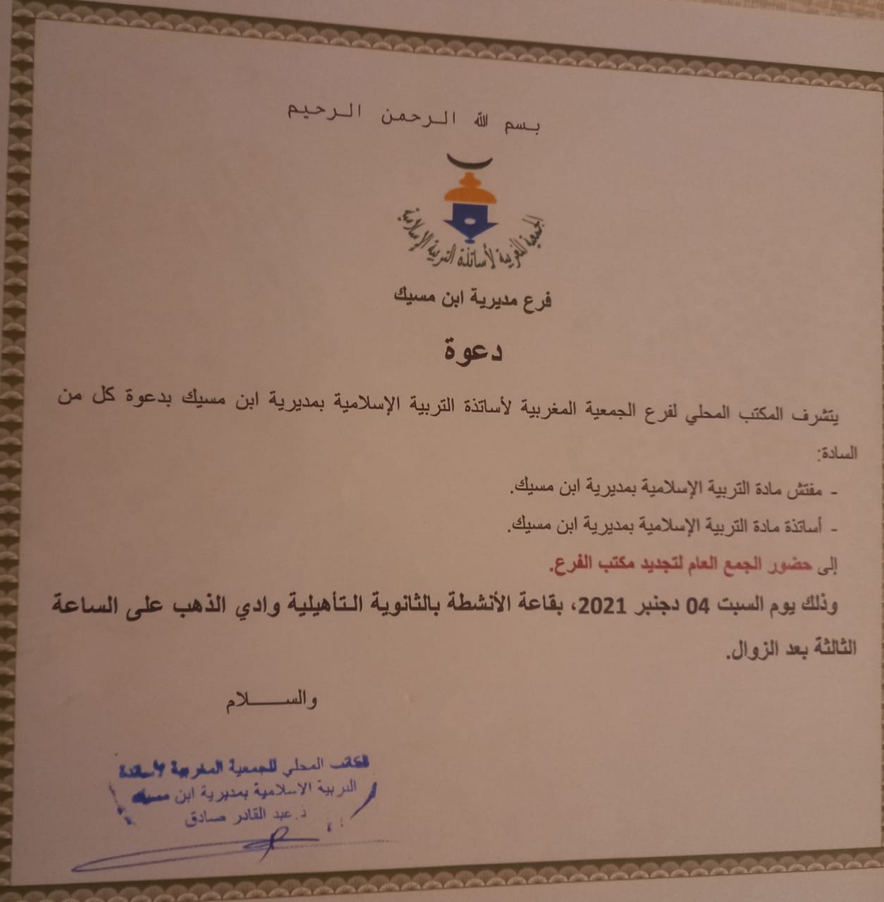 يتشرف مكتب فرع الجمعية المغربية لاساتذة التربية الاسلامية بمديرية ابن مسيك مفتشو و اساتذة مادة التربية الاسلامية بالمديرية ،لحضور أشغال الجمع العام العادي لتجديد المكتب المحلي للفرع، وذلك يوم السبت 4دجنبر 2021. بالثانوية التأهليلة وادي الذهب ابتداء من الساعة الثالثة زوالا.