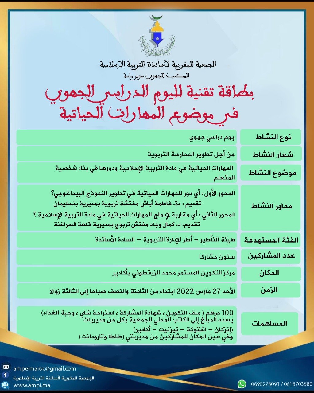 تحت شعار : “من اجل تطوير الممارسة التربوية” ينظم المكتب الجهوي للجمعية المغربية لأساتذة التربية الإسلامية يوما دراسيا جهويا في موضوع:”المهارات الحياتية في مادة التربية الإسلامية ودورها في بناء شخصية المتعلم”:تؤطره الدكتورة فاطمة أباش مفتشة بالمديرية الإقليمية بنسليمان،والدكتور كمال وجاد مفتش بالمديرية الإقليمية قلعة السراغنة.وذلك يوم الأحد 24 شعبان 1443ه/ 27 مارس 2022م، من التاسعة صباحا إلى الثالثة بعد الزوال بمركز التكوين المستمر محمد الزقطوني بأكادير .