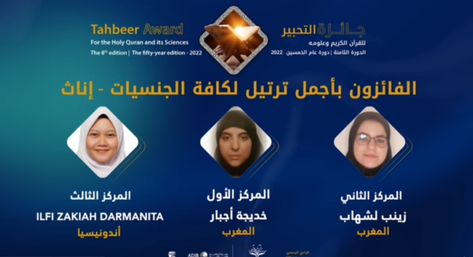 يواصل القراء والقارئات من المغرب الهيمنة على مختلف المسابقات الدولية المتعلقة بحفظ وترتيل القرآن الكريم. فبعد فوز المقرئ يونس غربي بالمسابقة العالمية “عطر الكلام للقرآن والاذان” بالمملكة العربية السعودية، استطاع القراء المغاربة الحصول على المراكز الأولى الثلاثة في فئة الذكور، والمرتبة الأولى والثانية في فئة الإناث، في مسابقة الترتيل “التحبير للقرآن الكريم وعلومه 2022” في الإمارات العربية المتحدة، في دورتها الثامنة التي تمت تسميتها بـ”دورة عام الخمسين”.