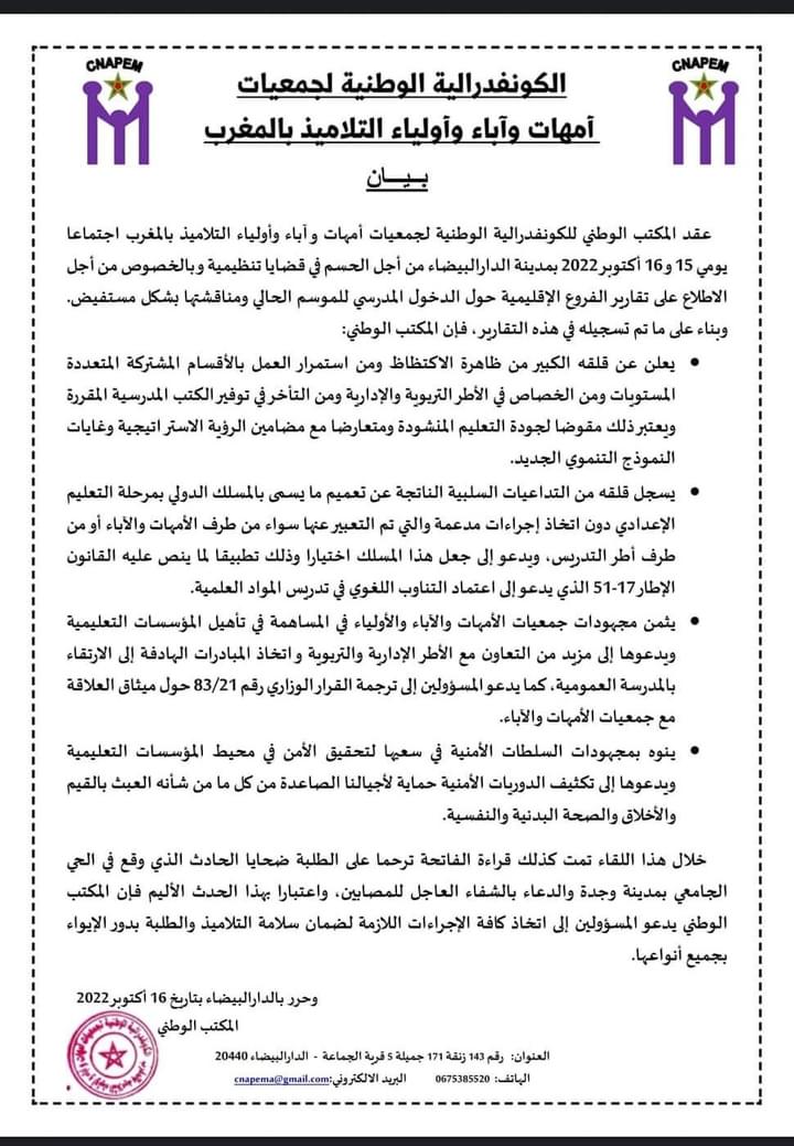دعت الكونفدرالية الوطنية لجمعيات أمهات وآباء وأولياء التلاميذ بالمغرب بيان لها إلى”_ تكثيف الدوريات الامنية في محيط المؤسسات التعلبمية لحماية اجيالنا الصاعدة من كل ما من شأنه العبث بالقيم والاخلاق والصحة البدنية والنفسية ”