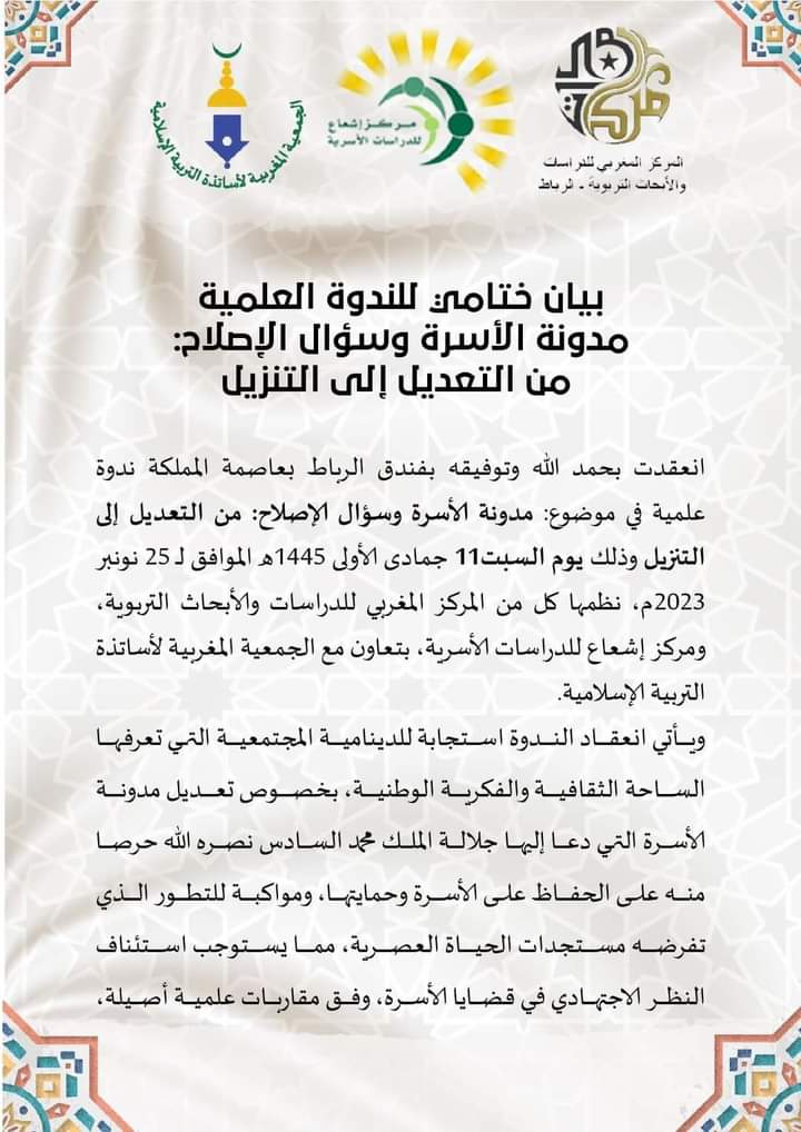 انعقدت بحمد الله وتوفيقه بفندق الرباط بعاصمة المملكة ندوة علمية في موضوع: مدونة الأسرة وسؤال الإصلاح من التعديل إلى التنزيل وذلك يوم السبت 11 جمادى الأولى 1445هـ الموافق لـ 25 نونبر 2023م، نظمها كل من المركز المغربي للدراسات والأبحاث التربوية ومركز إشعاع للدراسات الأسرية، بتعاون مع الجمعية المغربية لأساتذة