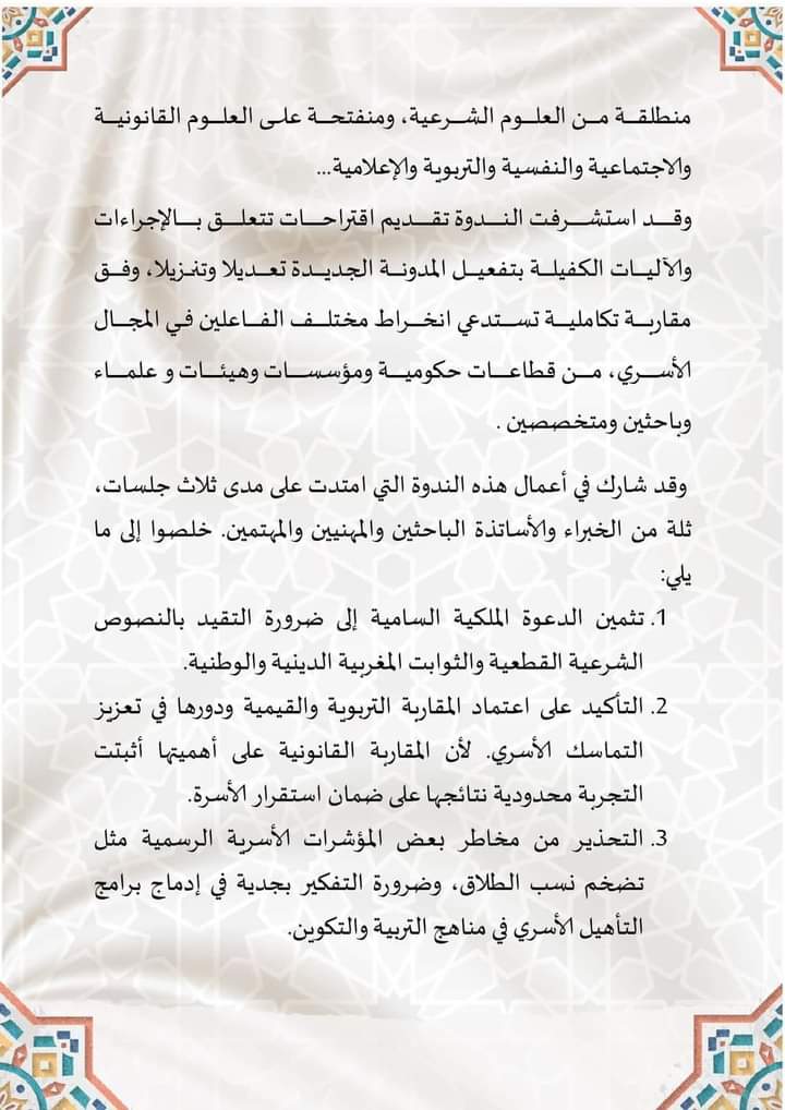 منطلقة من العلوم الشرعية، ومنفتحة على العلوم القانونية والاجتماعية والنفسية والتربوية والإعلامية…. وقد استشرفت الندوة تقديم اقتراحات تتعلق بالإجراءات والآليات الكفيلة بتفعيل المدونة الجديدة تعديلا وتنزيلا، وفق مقاربة تكاملية تستدعي انخراط مختلف الفاعلين في المجال الأسري، من قطاعات حكومية ومؤسسات وهيئات و علماء وباحثين ومتخصصين .