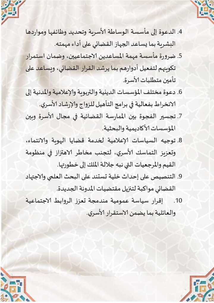 6. دعوة مختلف المؤسسات الدينية والتربوية والإعلامية والمدنية إلى الانخراط بفعالية في برامج التأهيل للزواج والإرشاد الأسري.