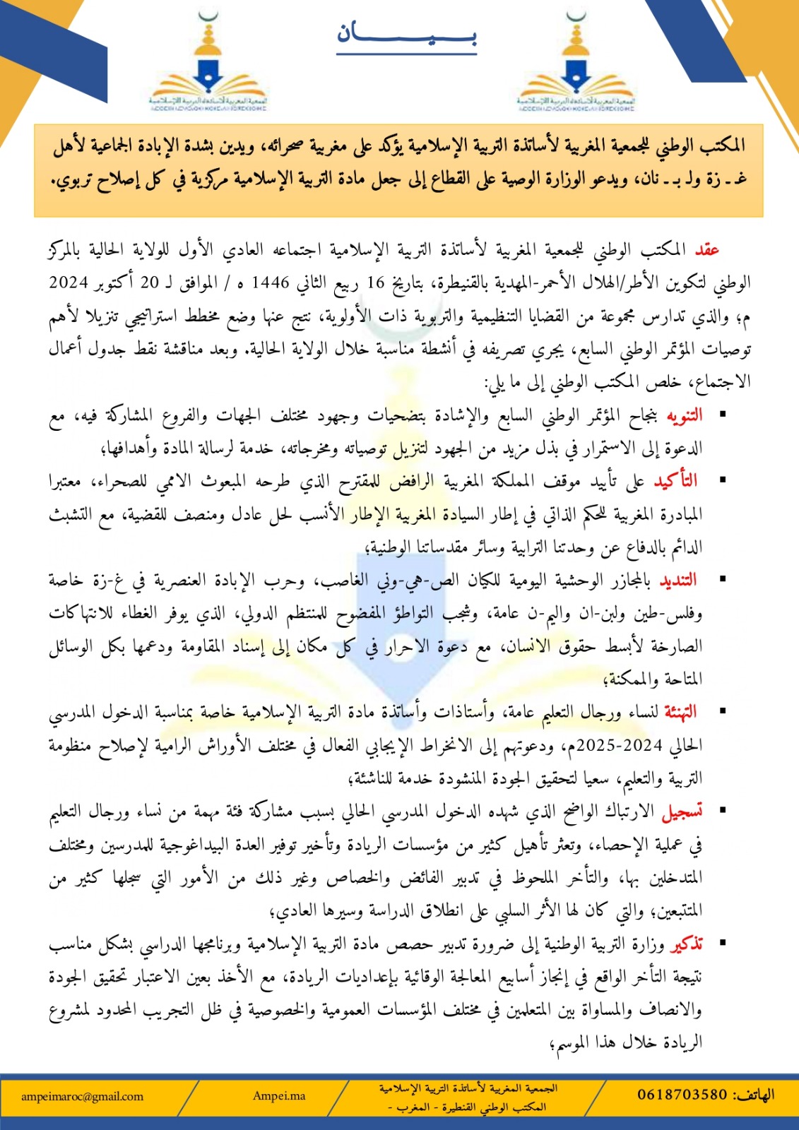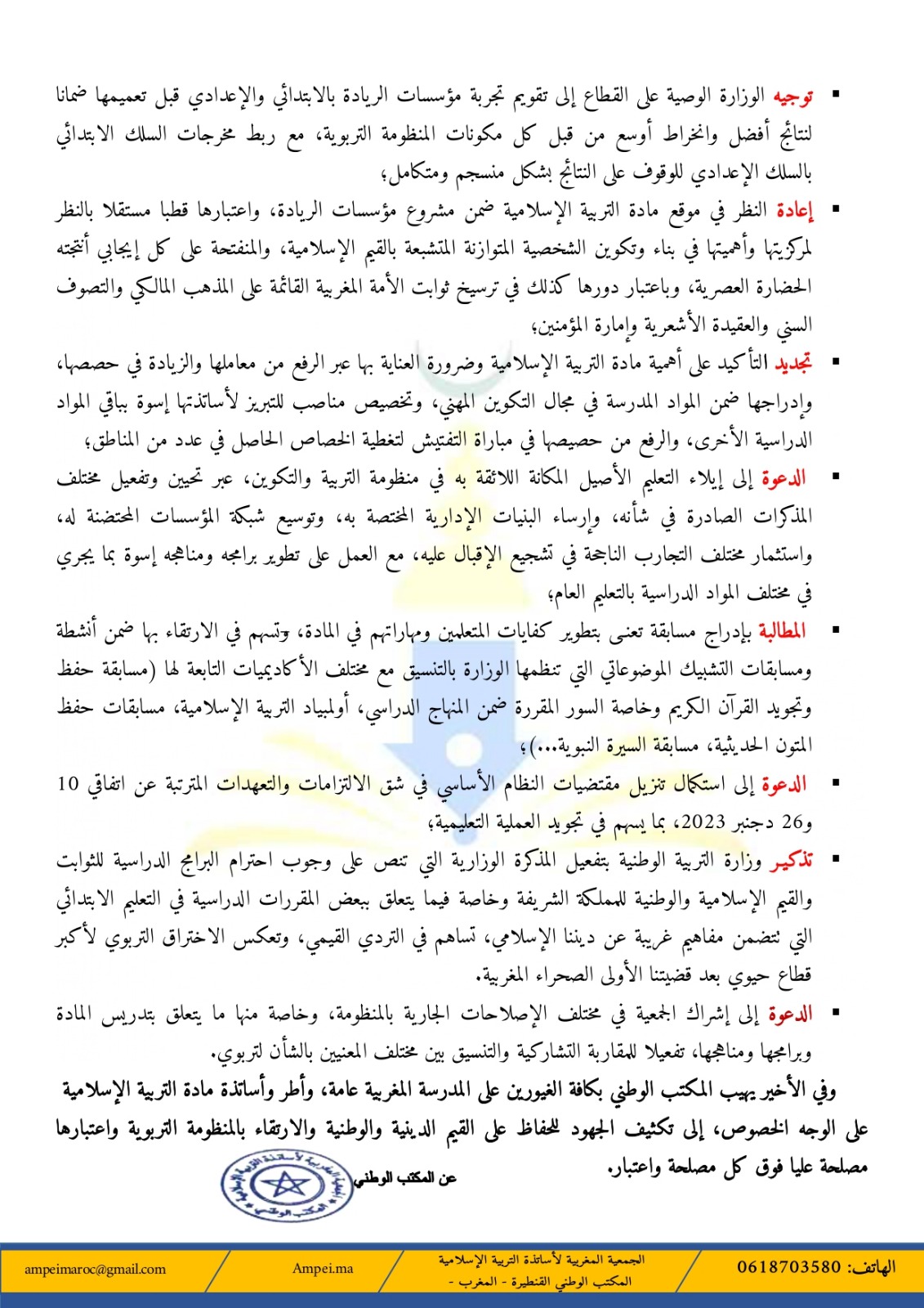 وفي الأخير يهيب المكتب الوطني بكافة الغيورين على المدرسة المغربية عامة، وأطر وأساتذة مادة التربية الإسلامية