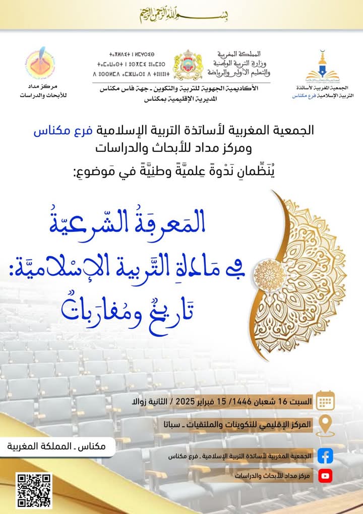 تعلن الجمعية المغربية لأساتذة التربية الإسلامية فرع مكناس، بالشراكة مع مركز مداد للأبحاث والدراسات، عن تنظيم ندوة علمية وطنية تحت عنوان: “المعرفة الشرعية في مادة التربية الإسلامية: تاريخ ومقاربات”، وذلك يوم السبت 16 شعبان 1445 هـ الموافق لـ15 فبراير 2025، على الساعة الثانية بعد الزوال، بالمركز الإقليمي للتكوينات والملتقيات سباتا بمدينة مكناس.